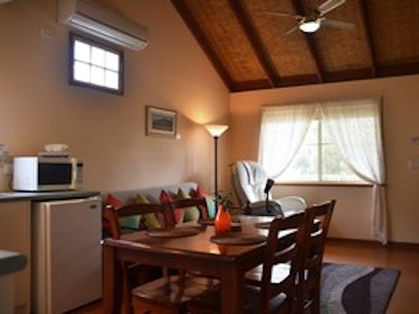 In a quiet corner of the property, this 1 bedroom cottage, with a Queen Bed, offers the utmost privacy. The spacious open plan kitchen/living area has an attractive vaulted ceiling and full kitchen facilities, including a coffee pod machine. There is a split system heating/cooling in the living area as well as massage chair, and a panel heater in the separate bedroom. The bathroom has a spa bath, with a shower over it. Sit on the front veranda and enjoy the views and bird life.