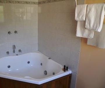 The open plan kitchen/living area is fully equipped with everything you need, including a coffee pod machine and massage chair, and is heated/cooled by a split system and ceiling fan. There is also a panel heater in the separate bedroom, which has a Queen Bed. The bathroom is also very spacious and has a spa bath with a shower over it.