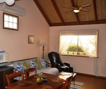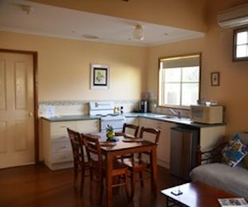 This 2 bedroom cottage is heated/cooled by a split system, with extra panel heaters in the bedrooms, The Kitchen/Living area has everything you need to make your stay comfortable along with a massage chair. The spacious bathroom has a spa bath with shower over it and self catering is easy in the fully equipped kitchen. The Main bedroom has a Queen Bed and the 2nd bedroom has a Queen bed plus a Single Bed